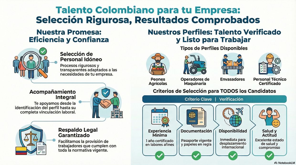 En Agrotalent Fruits Colombia S.A.S., nuestra principal función es apoyarte en la búsqueda, selección y provisión de talento colombiano, adaptando cada proceso a las necesidades de tu empresa.